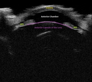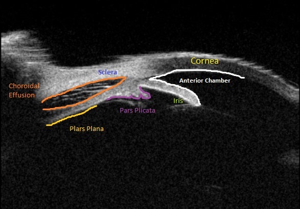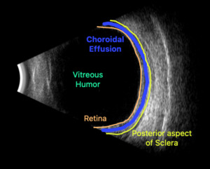Upon initial evaluation, the patient presented with stable vital signs. His IOP (normal range 10-21 mmHg) was found to be 54 in the right eye, 56 in the left eye. The patient received acetazolamide 250 mg IV and ophthalmology was consulted. Upon evaluation by ophthalmology, the IOP was 34 and 28. The patient was previously emmetropic, but reported persistent blurred vision, and had a manifest refraction of – 3.00 diopters in both eyes in the ED. Visual acuity was assessed with a near card without correction, and found to be 20/25 in the right eye, 20/25 in the left eye. Gonioscopy showed a closed angle in both eyes that could be opened with indentation. There was trace chemosis in the conjunctiva in both eyes, with shallow anterior chambers (Figure 1), and minimal inflammatory cells. The optic nerves appeared perfused, and there were shallow choroidal folds present in the macula. It was felt that his presentation was due to bilateral ciliary body effusion (Figure 2 & 3) causing anterior displacement of the lens-iris diaphragm, closing the angle and leading to this myopic shift.